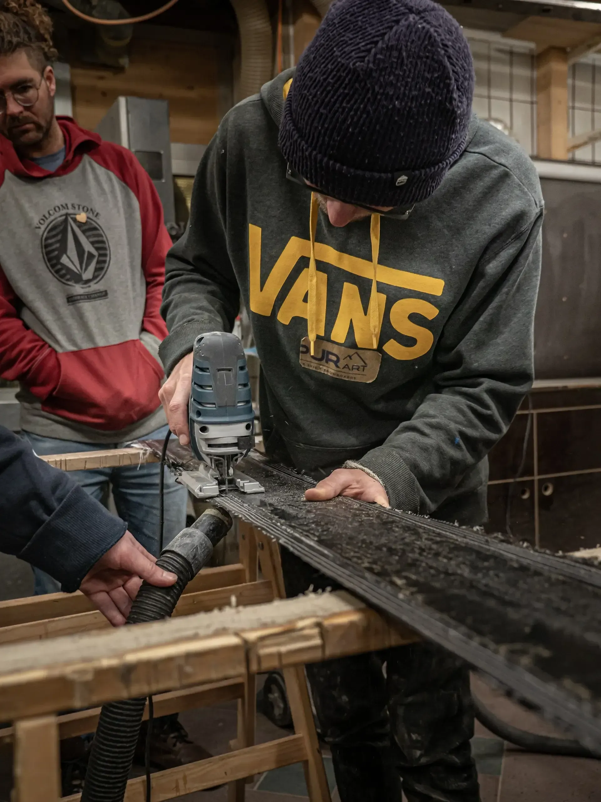 Ein Jahr zuvor: In Gedanken bastle, füge und klebe ich meinen Ski langsam zusammen, werfe alles wieder über den Haufen, fange erneut an und fertige eine Skizze. Diese sende ich schließlich nach Innsbruck. Empfänger: SPURTart. Michi Freymann und Peter Pfeifer bearbeiten meine Idee weiter, bereiten alles für den Workshop vor. Die beiden SPURart Gründer wissen, worauf es ankommt. Hochwertige Materialien. Höchste Präzision. Aktuellste Fertigungsmethoden. Und natürlich jede Menge Spaß – denn ohne den geht gar nichts.
