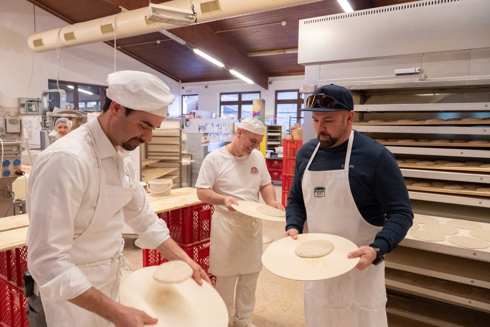 Benjamin Profanter dreht geschickt das Holzbrett in seinen Händen. Zeitgleich zieht er es immer wieder nach unten weg und lässt die klebrige Masse auf der dann schräg gehaltenen Tafel wieder aufschlagen. Diesen Vorgang wiederholt er einige Male, bis innerhalb weniger Sekunden das Schüttelbrot ausgeschüttelt ist. Auch wir versuchen das, müssen aber nach wenigen Versuchen und einer Handvoll zerknäulter Teigfladen das Handtuch werfen. Was so leicht aussieht, ist echtes Handwerk und will gelernt sein!