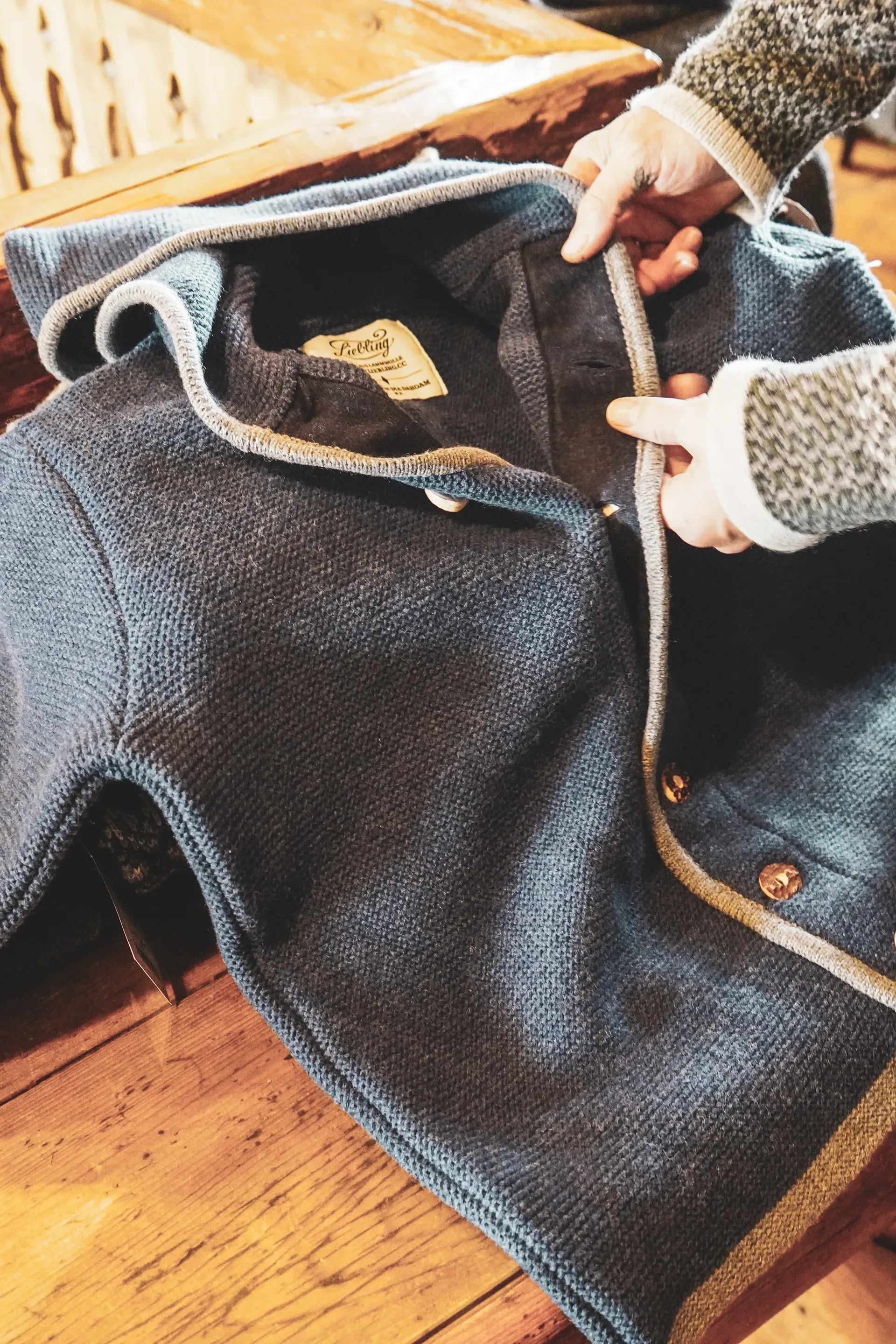 Zwei Neuerungen oder ich würde vielmehr von Durchbrüchen sprechen, faszinieren mich besonders. Schaffwolltex nennt sich die Innovation, für die Tom im Jahr 2022 das Patent bekommt. Ihm ist es gelungen, die Merinowolle so anzurauen, dass sie wind- und wasserabweisend wird. Der bayerische Janker, voller Wohlgefühl, rein aus der Natur gewonnen, ohne Chemie. Neben dieser Errungenschaft darf wohl noch erwähnt werden, dass dadurch auch Kulturgut erhalten wird. Wollschafe, die es heute kaum noch gibt, werden dank des Pioniergeistes von Tom wieder mehr und prägen das Landschaftsbild sowie die Biodiversität. Schick für die Umwelt, schick für uns Menschen. Ziemlich schick finde ich auch das Liebling Mala Muster, das erste Muster, das Liebling je gestrickt hat. Die ursprünglich geplanten zwölf Farben ließen sich allerdings nicht umzusetzen und so einigt sich das Designteam auf fünf Farben. Anthrazit, Hellgrau, Grün, Blau und Weiß, woraus nun das Mala Muster besteht und auf Modellen wie Martl und Senner zu finden ist. Verarbeitet wurde in diesen Besonderheiten die weichste Wolle. Dazu selektiert die Garnspinnerei aus Italien per Hand die reinsten Fasern und spinnt daraus das edle Garn. Manufaktur durch und durch.