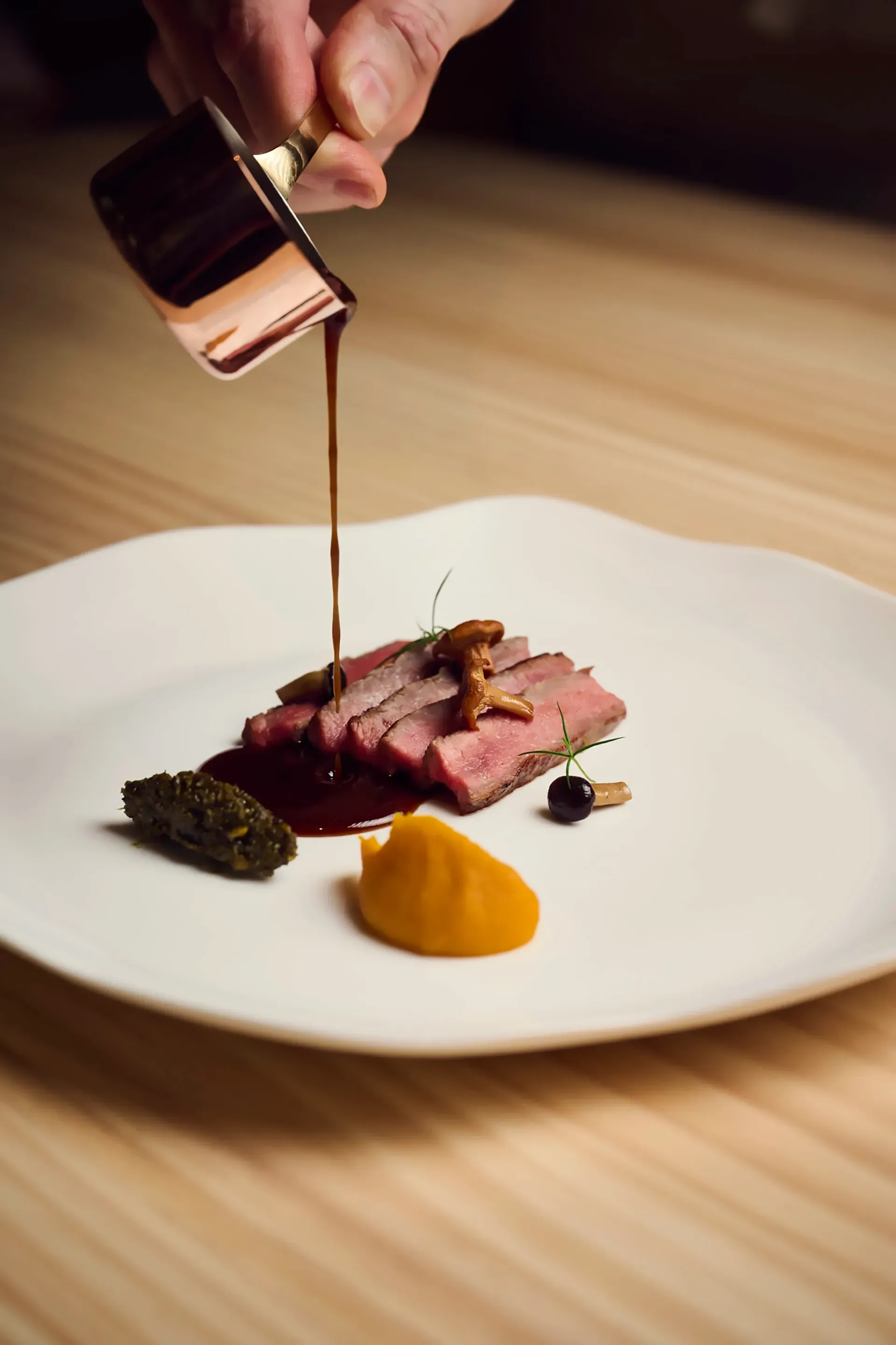 Noch immer an der Bar, kommen derweil die ersten Amuse-Bouches, die „ricordi“ heißen, Erinnerungen an die Kindheit. Die Reisbällchen, die „bracciole di riso“ seien ein Rezept ihrer Oma, erklärt Stefania. „Die haben wir in Kalabrien gegessen, bis wir fast platzten.“ Den größeren Applaus von uns bekommen jedoch der Steinpilz-Raviolo mit Champignon-Espuma und Waldpilz-Essenz sowie die üppige Dampfbrot Pilzschnitte, die so herrlich nadelwaldig und pilzig schmeckt, dass man sich am liebsten hineinsetzen würde.