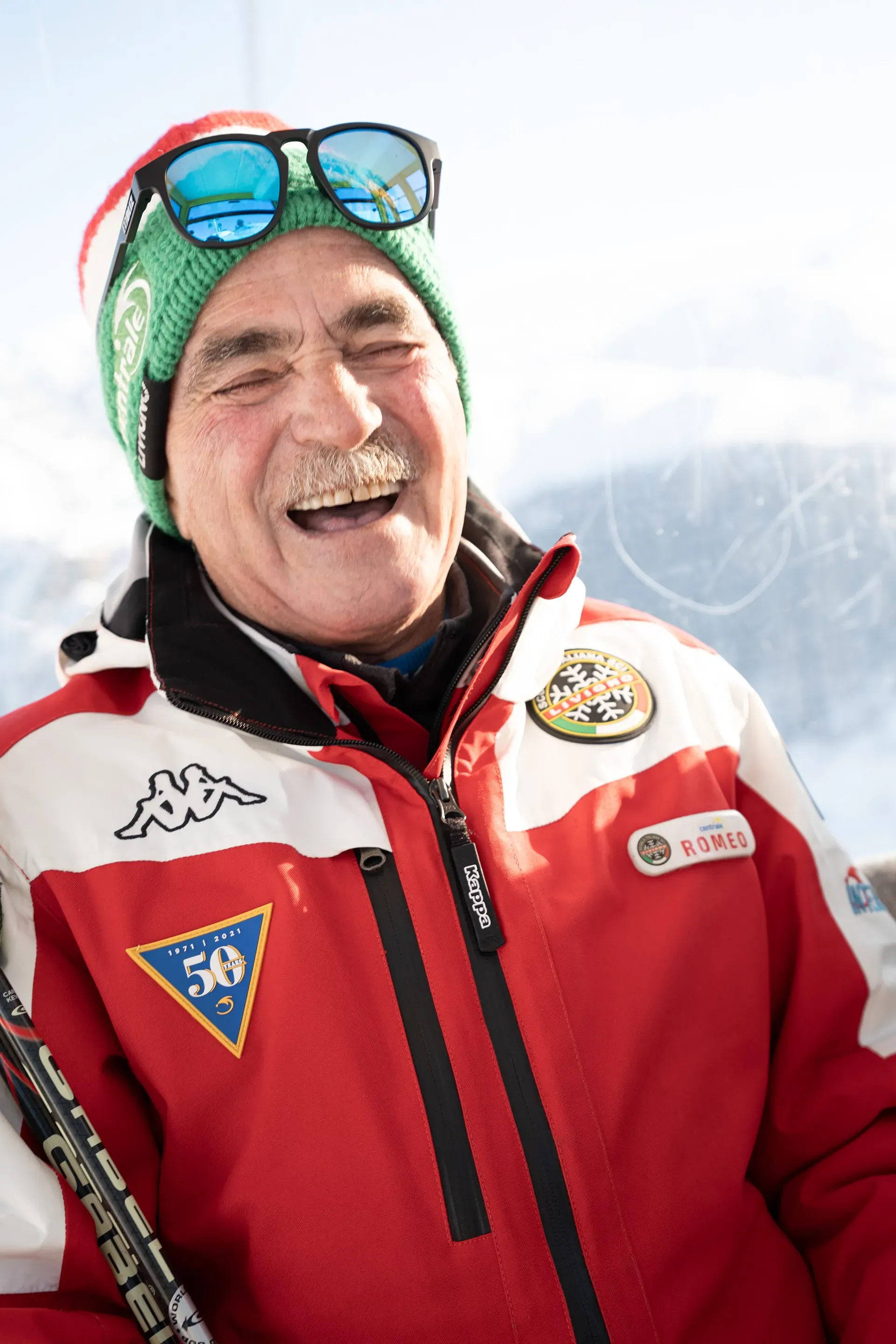 Romeo Antonioli treffen wir erstmals an der Scuola Sci Centrale, auf der Westseite des Tales. Die Wollmütze in Grün, Weiß, Rot. Schick verspiegelt die Sonnenbrille. Und ein grauer Schnauzbart, unter dem unaufhörlich ein schallendes Lachen erklingt. In der Gondel lernen wir uns kennen – soweit das überhaupt nötig ist. Denn bald schon kommt es uns so vor, als würden wir uns seit einer Ewigkeit kennen. Übrigens: Der Mittsiebziger feiert in dieser Saison Jubiläum. Stolze 50 Jahre ist er nun schon Skilehrer. Grund zur Freude! Dann aber, kurz vor Erreichen der Bergstation, wird Romeo still. Jetzt spürt er endlich die ersten Sonnenstrahlen im Gesicht, schließt die Augen, kehrt in sich. Morgenroutine?