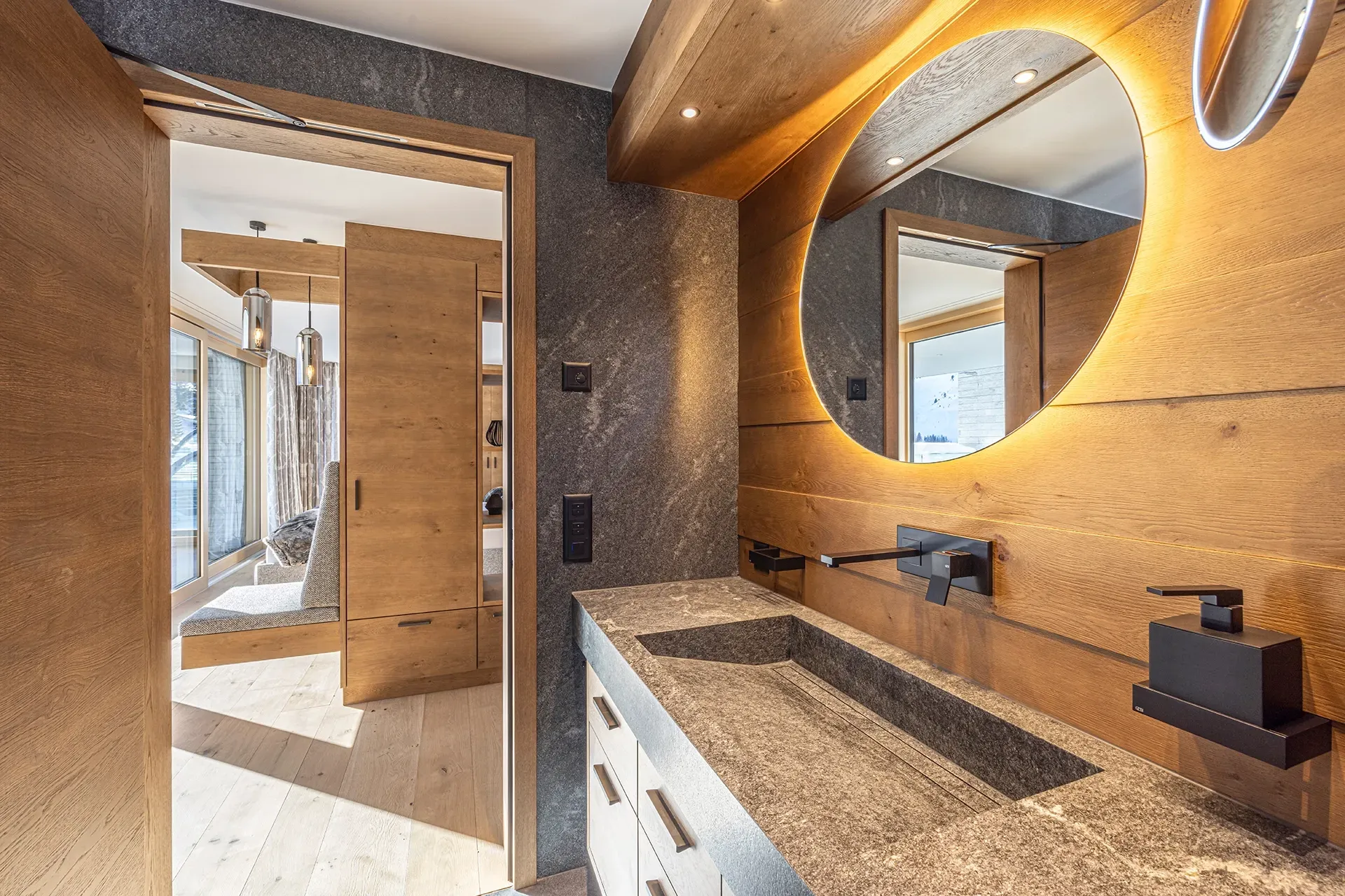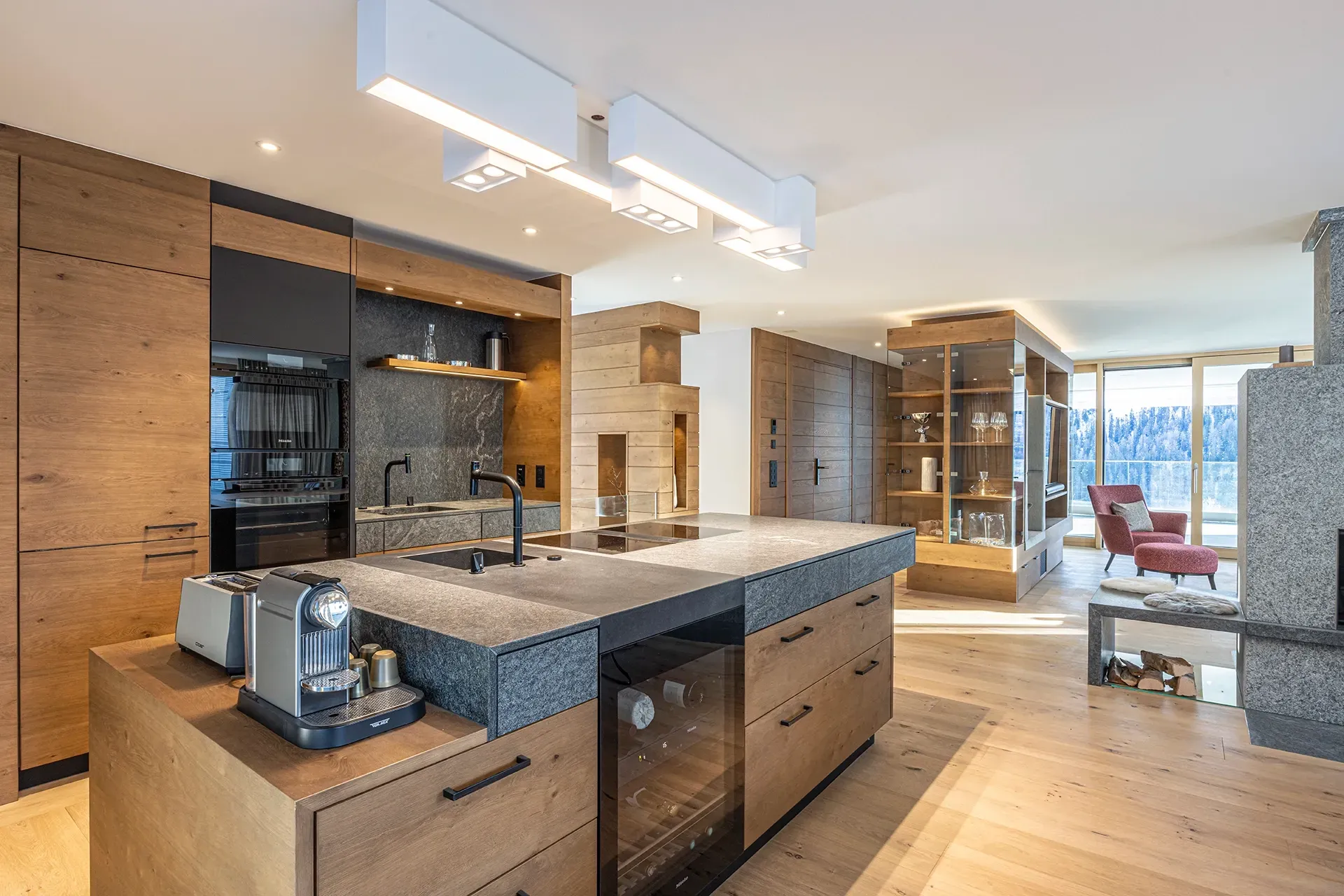 Auch in Küche und Essbereich, Schlafzimmer und Bädern wird der Stil konsequent umgesetzt. Durch Wiederholung der Materialien und Gestaltungselemente entsteht eine ruhige Atmosphäre – genau das richtige für den Rückzug nach einem langen Ski- oder Wandertag und die Erholung nach einer langen Arbeitswoche. „Eine solch hochwertige und zeitlose Einrichtung sorgt für ganz viel Wohnfreude – und das hoffentlich ein Leben lang“, sind sich Pamela Baur und Sabine Neuhaus einig.