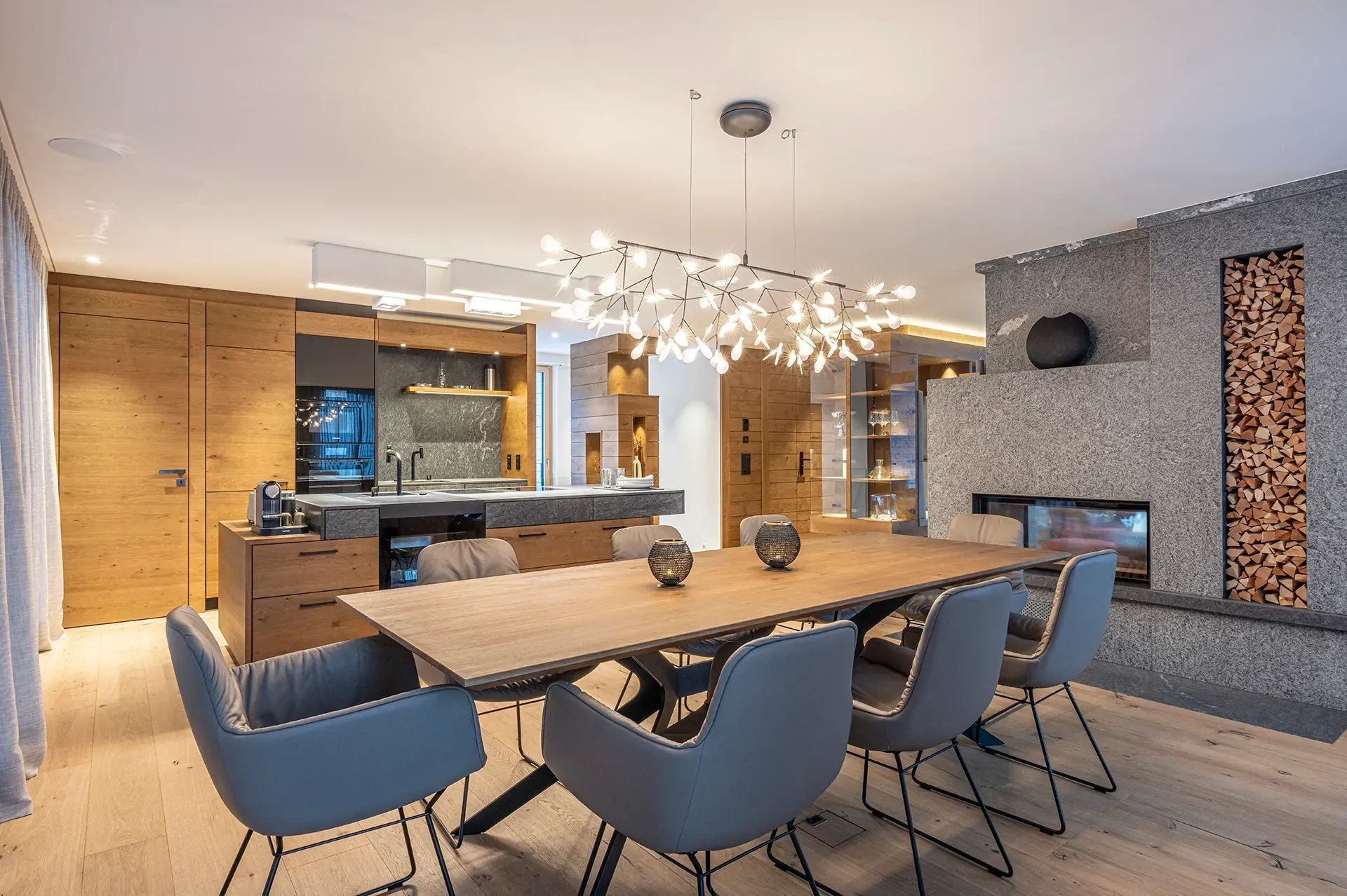 Richtung Küche separiert ein ausladender Kamin diesen vom restlichen Raum. Komplett mit dunklem Granit verkleidet, ist dieser auch optisch ein monumentaler Hingucker, der für behagliche Stimmung sorgt.