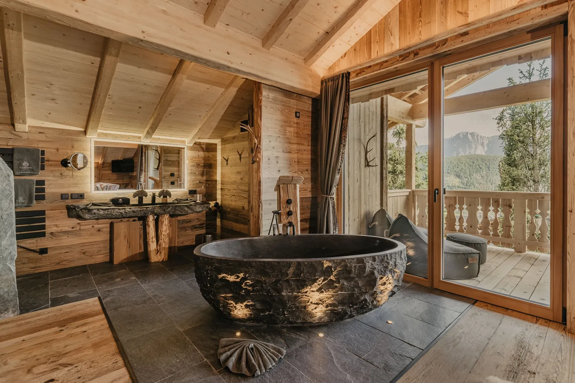 Die Chalets und Lodges kombinieren traditionelle Materialien wie Schiefer, Altholz und Granit mit modernem Design und höchstem Komfort. Großzügige Terrassen und grüne Wiesen, private Whirlpools und Panoramasaunen bieten Gästen ein unvergleichliches Wohlfühlerlebnis mit Blick auf das imposante Schlernmassiv. Viele Details, von handgefertigter Einrichtung bis hin zu dekorativen Elementen erzählen Geschichten aus der Region.