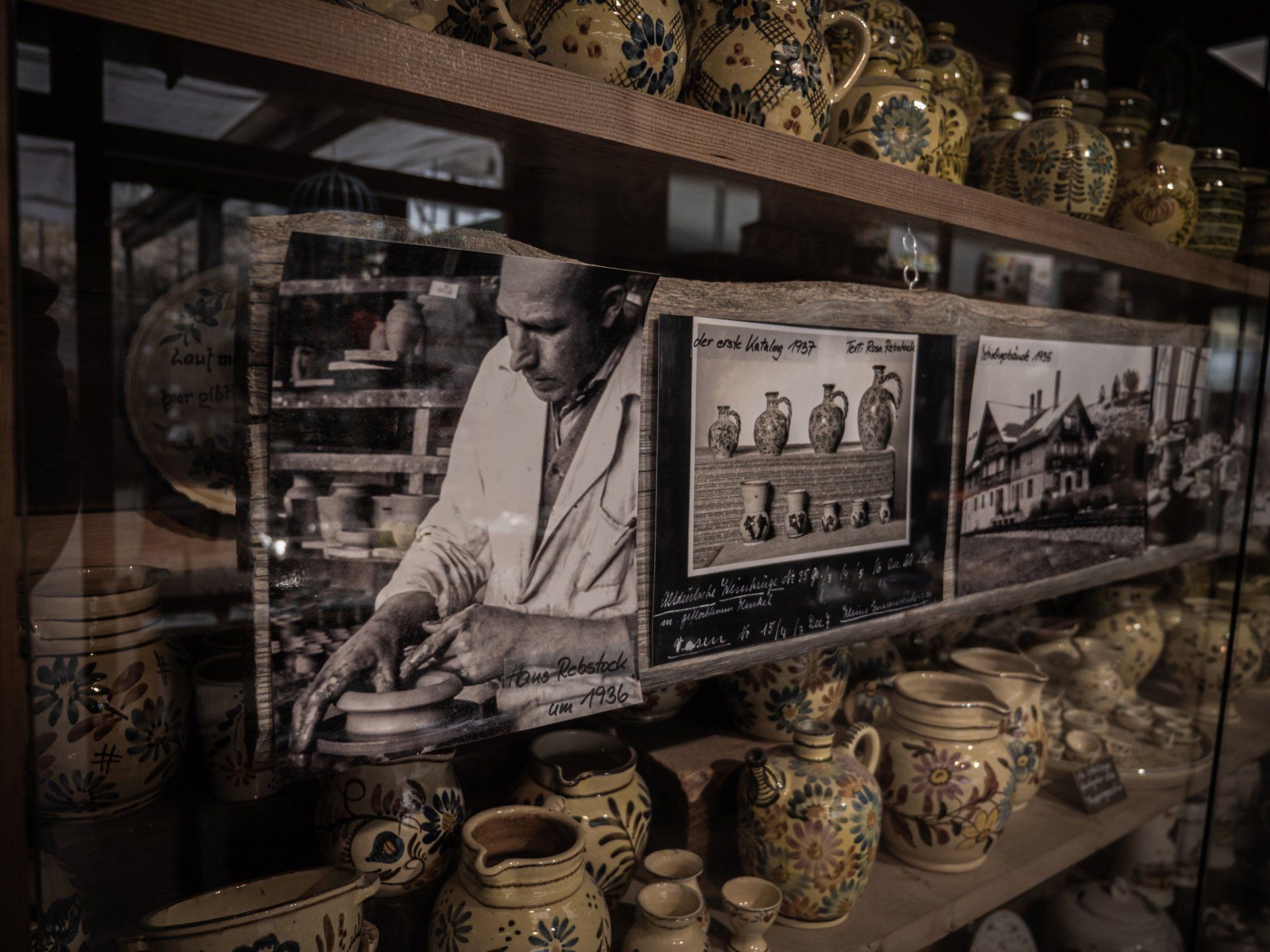 In einer meterlangen Glasvitrine bestaunen wir fast einhundert Jahre alte Krüge und Teller. Für Ruth ist hierbei vor allem spannend, wie sich der Malstil über die Jahrzehnte verändert hat. Mir dagegen sticht eine Fotografie ins Auge. Auf dem schwarzweißen Bild ist Hans Rebstock, Ruths Großvater zu sehen, wie er konzentriert an der Töpferscheibe sitzt. Im Hintergrund ist ein einfaches Holzregal zu sehen. Zweifelsfrei ist es das Regal im Raum über uns, in dem heute die Scherben lagern. Die Fotografie wurde in den 30er-Jahren aufgenommen.