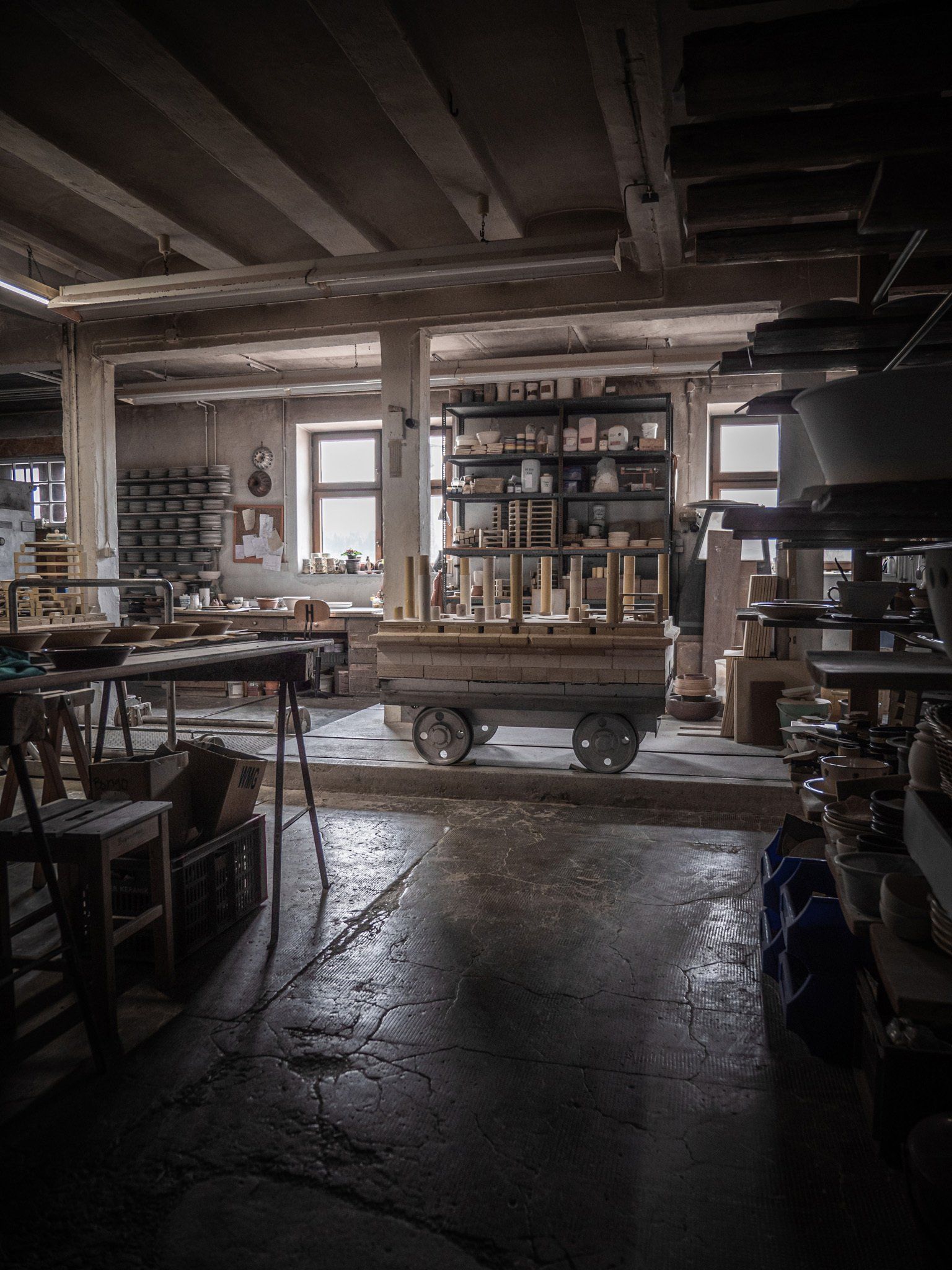 in dem die Zeit stehen geblieben zu sein scheint. Es riecht. Nach Holz. Und noch nach etwas anderem. Es sind die unzähligen kleinen Meisterwerke, die diesen Duft aussenden. Teller, Schüsseln, Becher, Krüge, allesamt in ihrer Schönheit vollkommen. Makellos stehen sie hier gestapelt. In einem uralten Holzregal, in einem Raum, in dem überhaupt nichts mehr gerade oder gar perfekt zu sein scheint, strahlen die Scherben eine fehlerlose Reinheit aus.